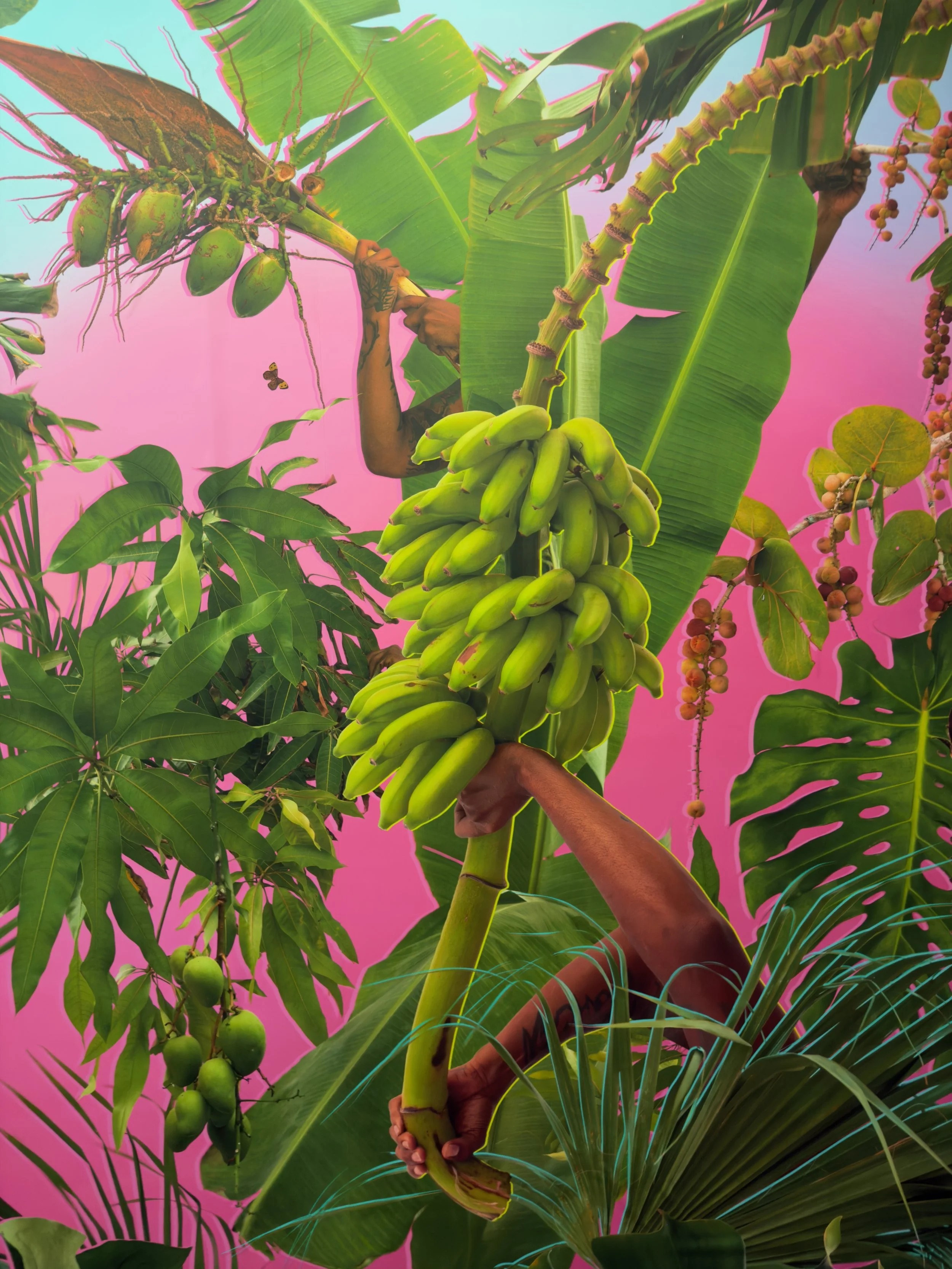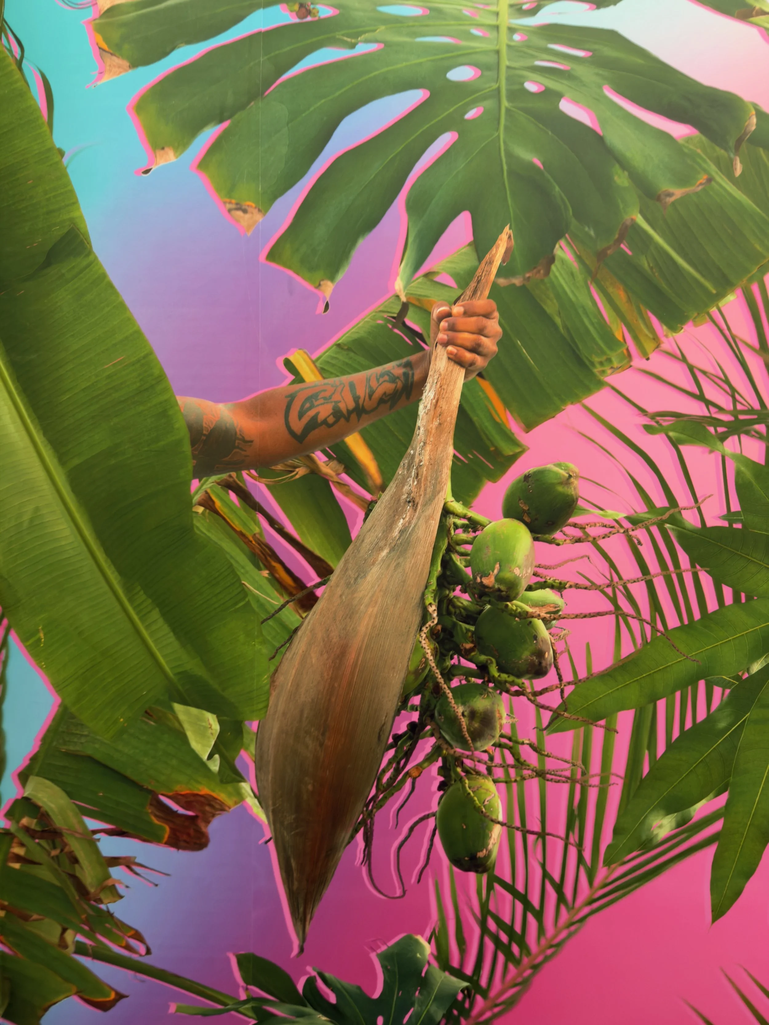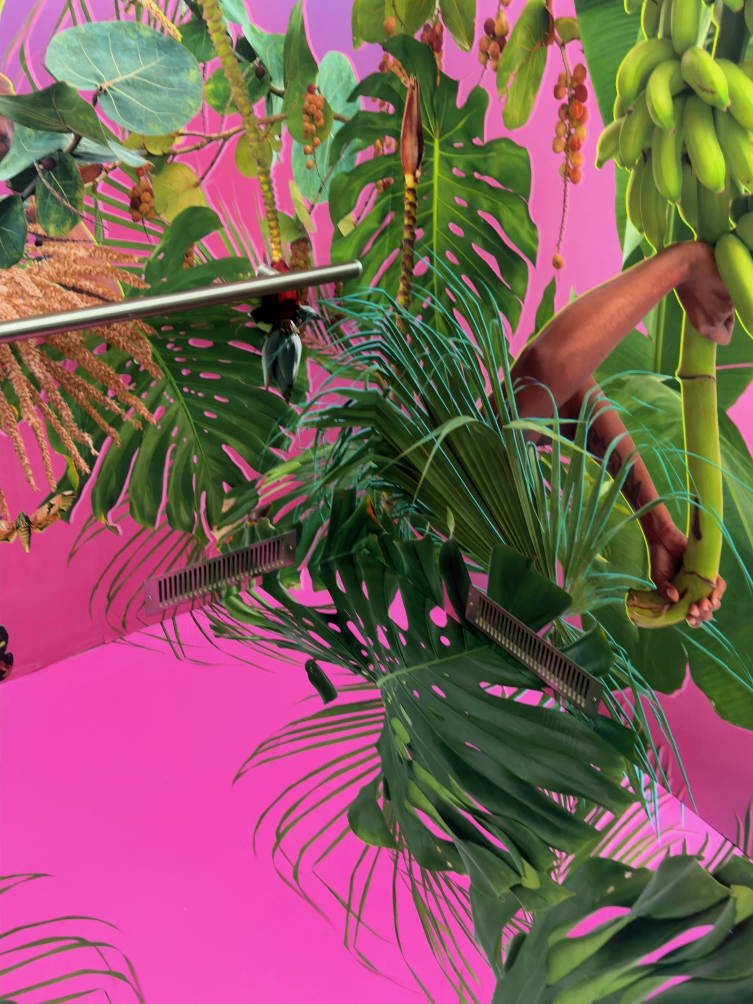 All Tomorrow’s Parties (Bungle in the Jungle) transforms the elevator at The Bunker into a luminous installation artwork as a temporal portal. Built from photographs the artists have taken in West Palm Beach just after hurricane Mathew in 2016, everything in the artwork comes from edible flora found in public spaces—banana plants, coconuts, sea grapes—fragments of a landscape. These elements create a kaleidoscopic trompe-l’œil that references West Palm Beach and transforms the elevator into a vertical time machine. Like the title of the artwork suggests, pop music legends illuminate the culture of becoming—the shimmering optimism of youth, the belief that something extraordinary is just beginning. All Tomorrow’s Parties (Bungle in the Jungle) echoes that spirit, using the vertical motion of the elevator as a metaphor for perpetual conditions of flux. As the doors close, visitors enter a hot-pink vortex where fragments of fruit and flora create a devotional, almost resurrection-like space. This installation invites viewers to witness how nature, myth, and memory revives themselves again and again, always embracing the future. West Palm Beach itself was formed by a mythic beginning: a shipwreck more than a century ago scattered tens of thousands of coconuts along the shoreline, accidentally branding the region as a tropical paradise. This origin story functions like a modern creation myth—unexpected, hopeful, and formative— much like another Florida legend: the Fountain of Youth, the enduring promise that renewal is always possible and that transformation is always-ever so slightly-within reach.