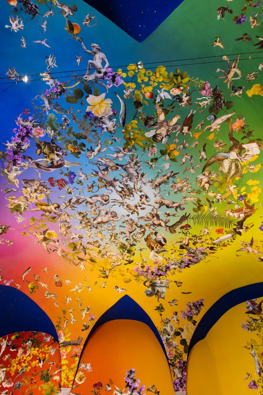 Love Trap / Trappola d’Amore, Austin Young and David Allen Burns / Fallen Fruit, 2022. custom asynchronous repeat pattern created by the artists and printed with archival watercolor on biodegradable cotton fabric installed onto the ceilings and walls and accessorized with complimenting refinished furniture for the historic ‘Sibille room’. Commissioned as a site-specific installation for CRAZY, curated by Danil Eccher, at Chiostro del Bramante, Rome, Italy. The artwork is now permanent.